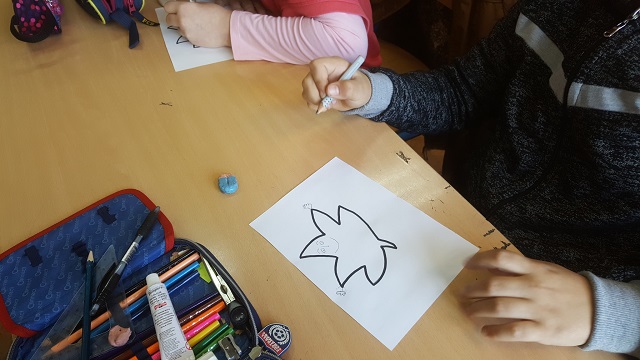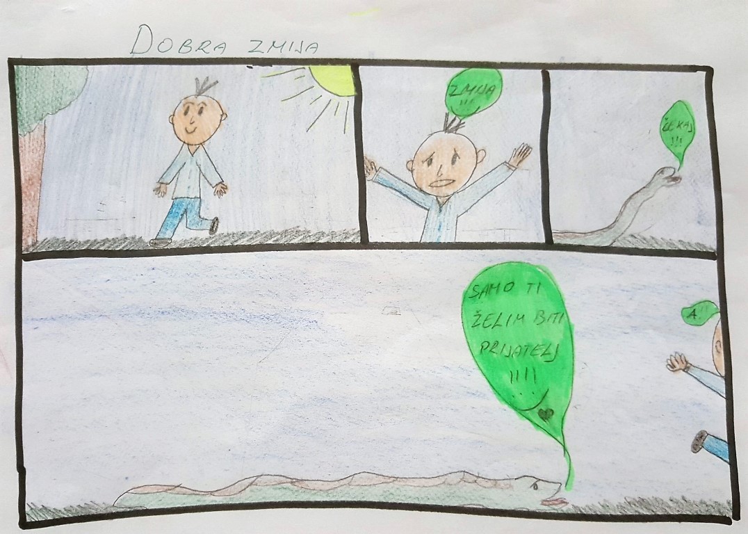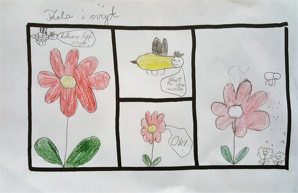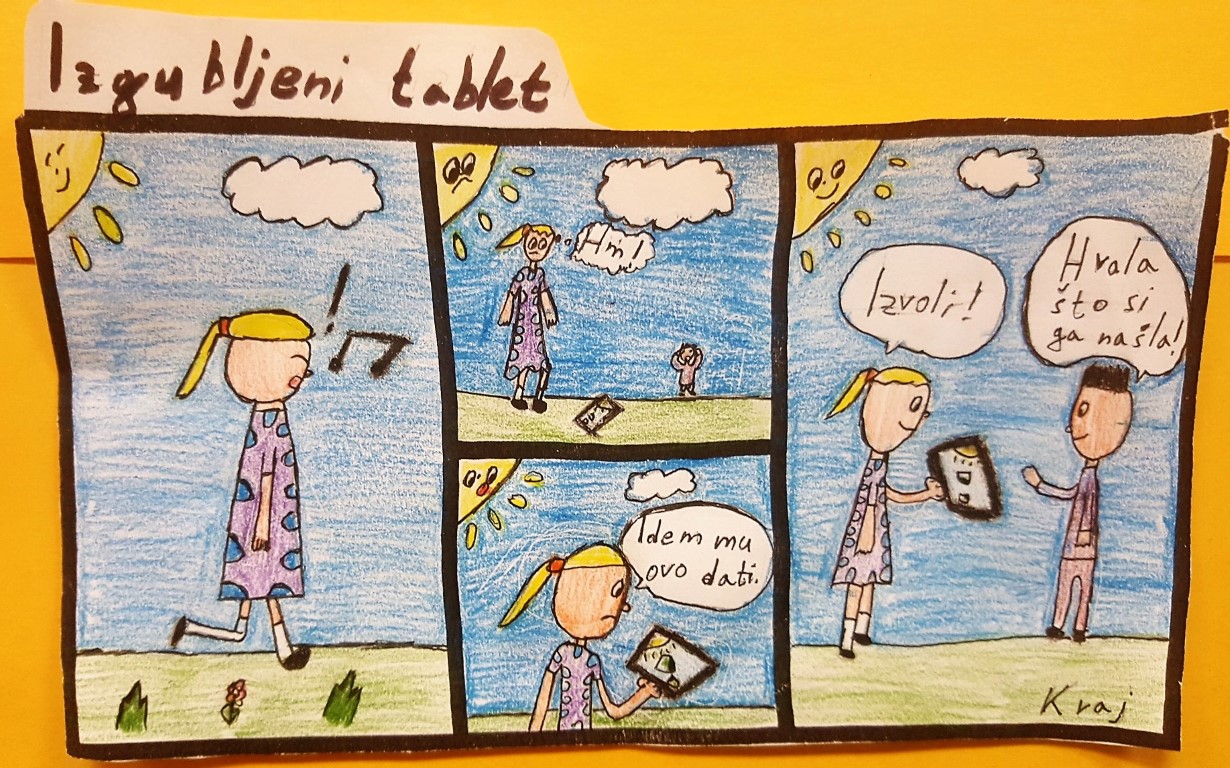 Knjižničarka je nacrtala na ploči kratak strip od četiri kadra, a mi smo dobili nacrtane oblike koje smo „oživjeli“ tj. pretvorili u likove. Na kraju smo dobili zadatak da sami nacrtamo svoj strip prema zadanoj temi.