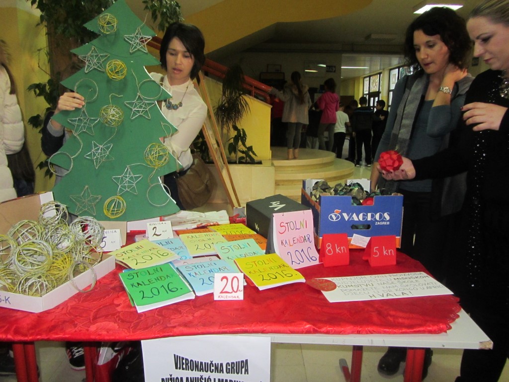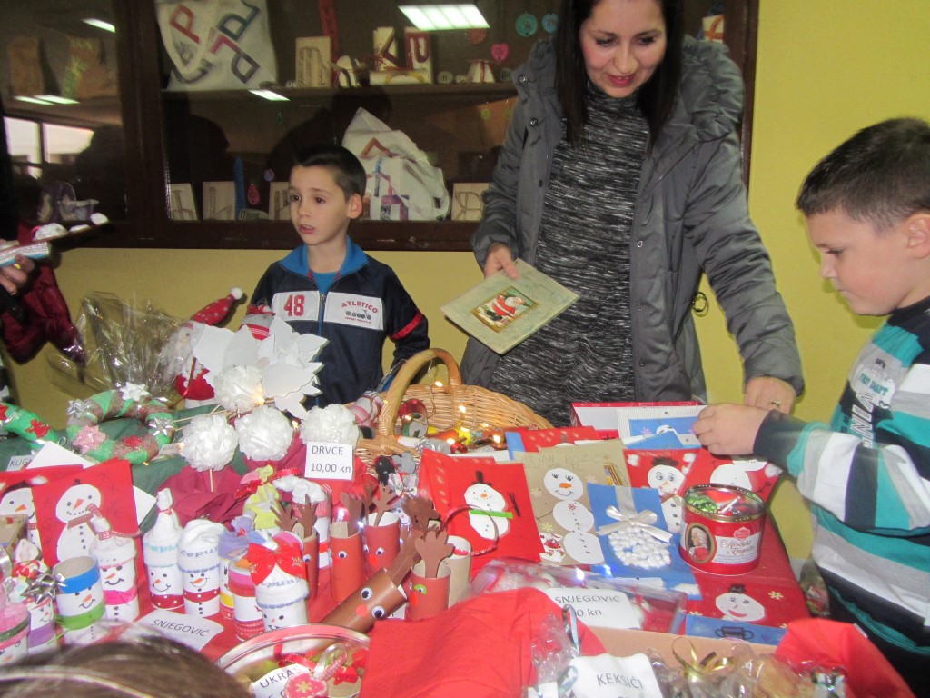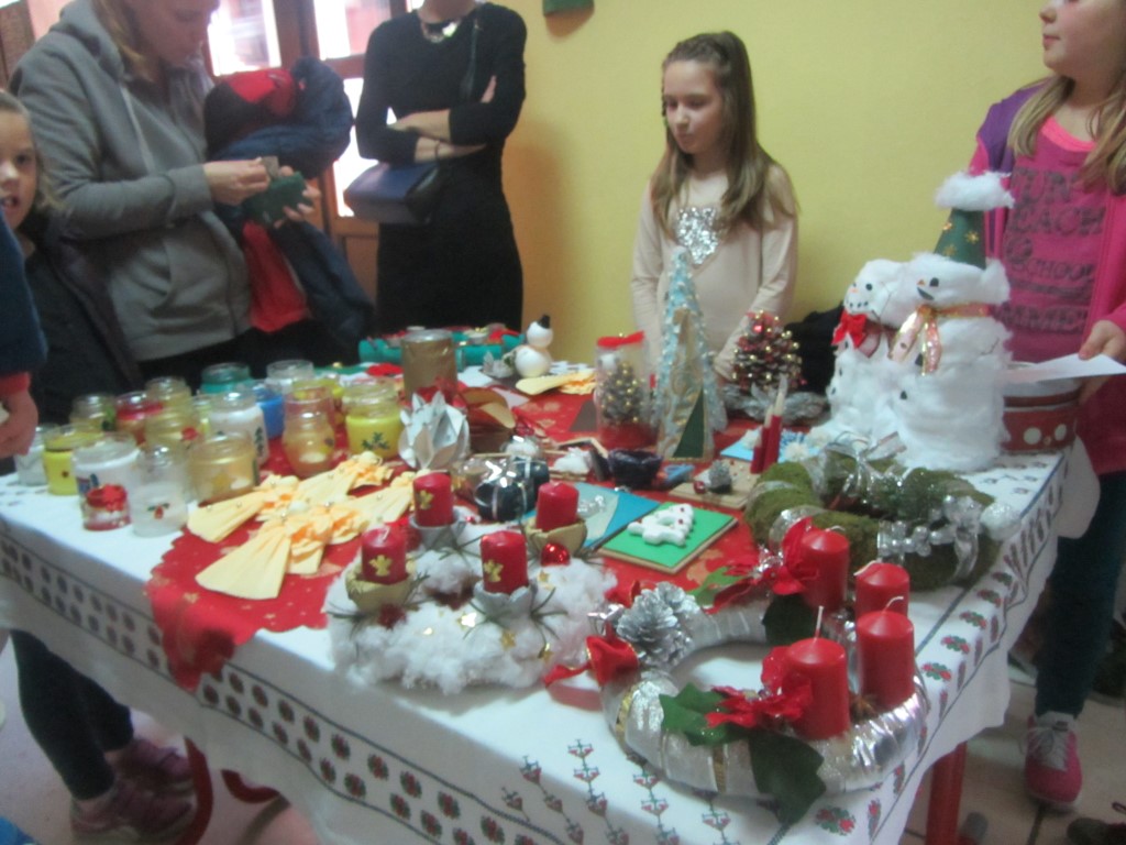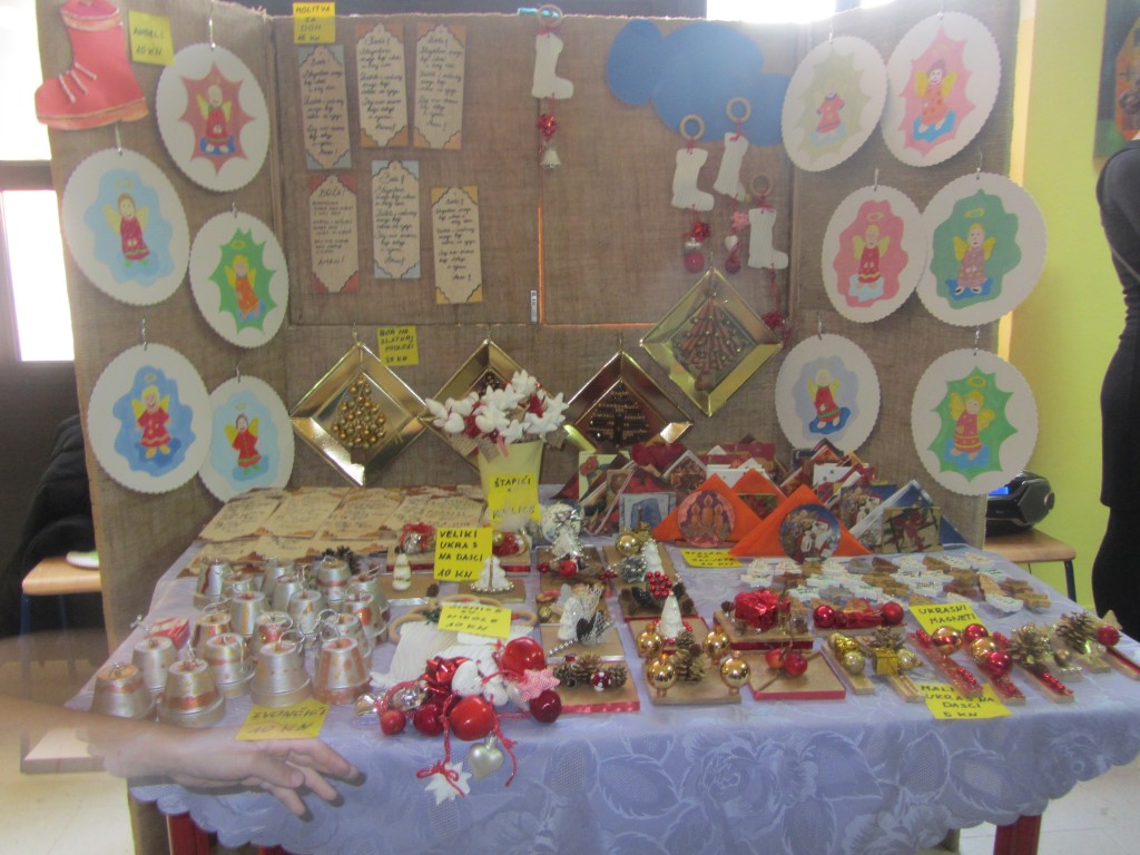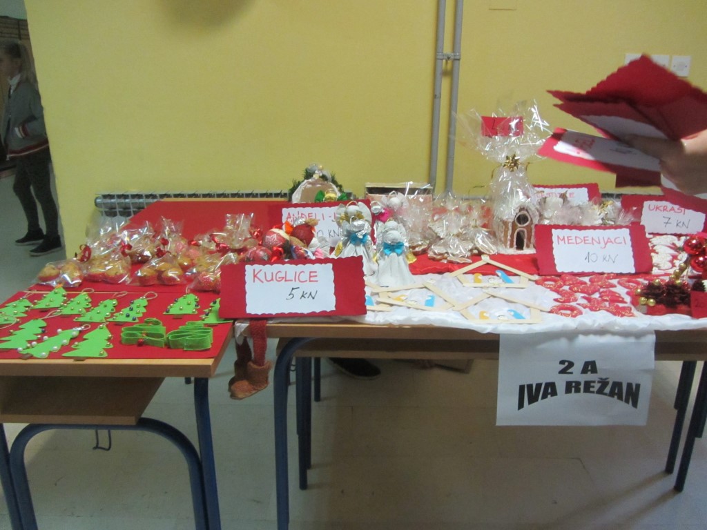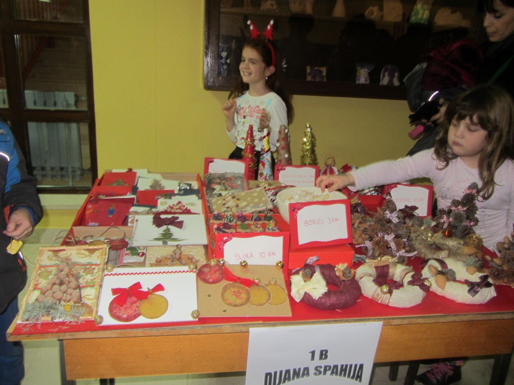 Na štandovima smo primijetili vijence, jelke, snjegoviće, čestitke, ukrasne kutije, kolače, kuglice, kalendare, svijeće, anđele i još puno, puno kreativnih i veselih rukotvorina. Potražnja i odaziv posjetitelja su bili veliki. Kao uvijek, najbolji su kupci bili naši roditelji i učitelji. Prikupljeni novac je otišao u dobrotvorne svrhe - pola svote novca donirano je za knjižnicu, a druga polovica svote novca je namijenjena za djecu Afrike jer naša škola ove se godine uključila u UNICEF-ov program pomoći djeci Afrike. Najviše su novca zaradili niži razredi čiji su štandovi bili najveseliji i oko njih se stvarala najveća gužva, ali ove godine pohvalili bismo 5. a. razred koji je po 440 kn dao i za knjižnicu i za djecu Afrike te se istaknuo svojom poduzetnošću i velikodušnošću.